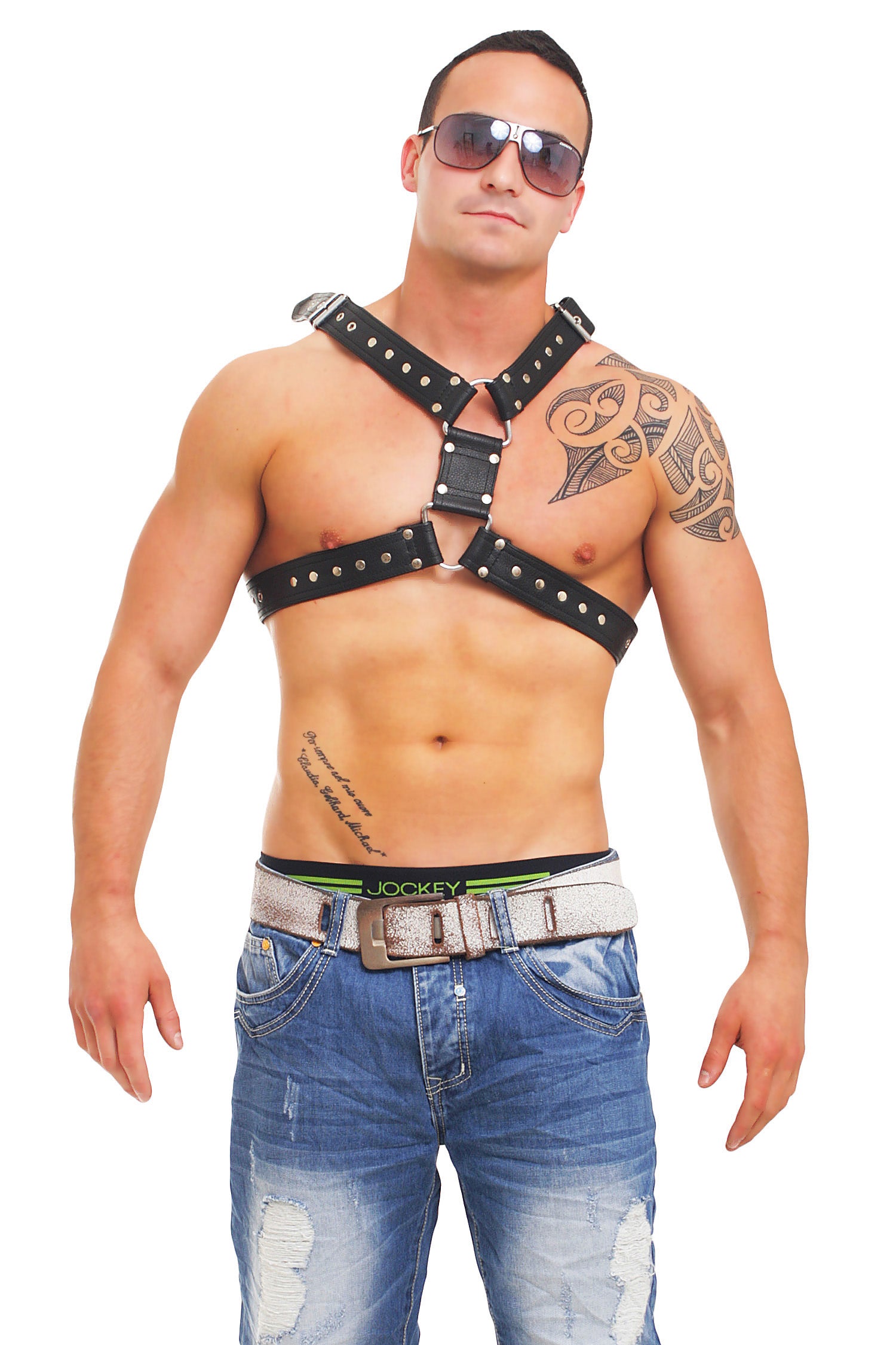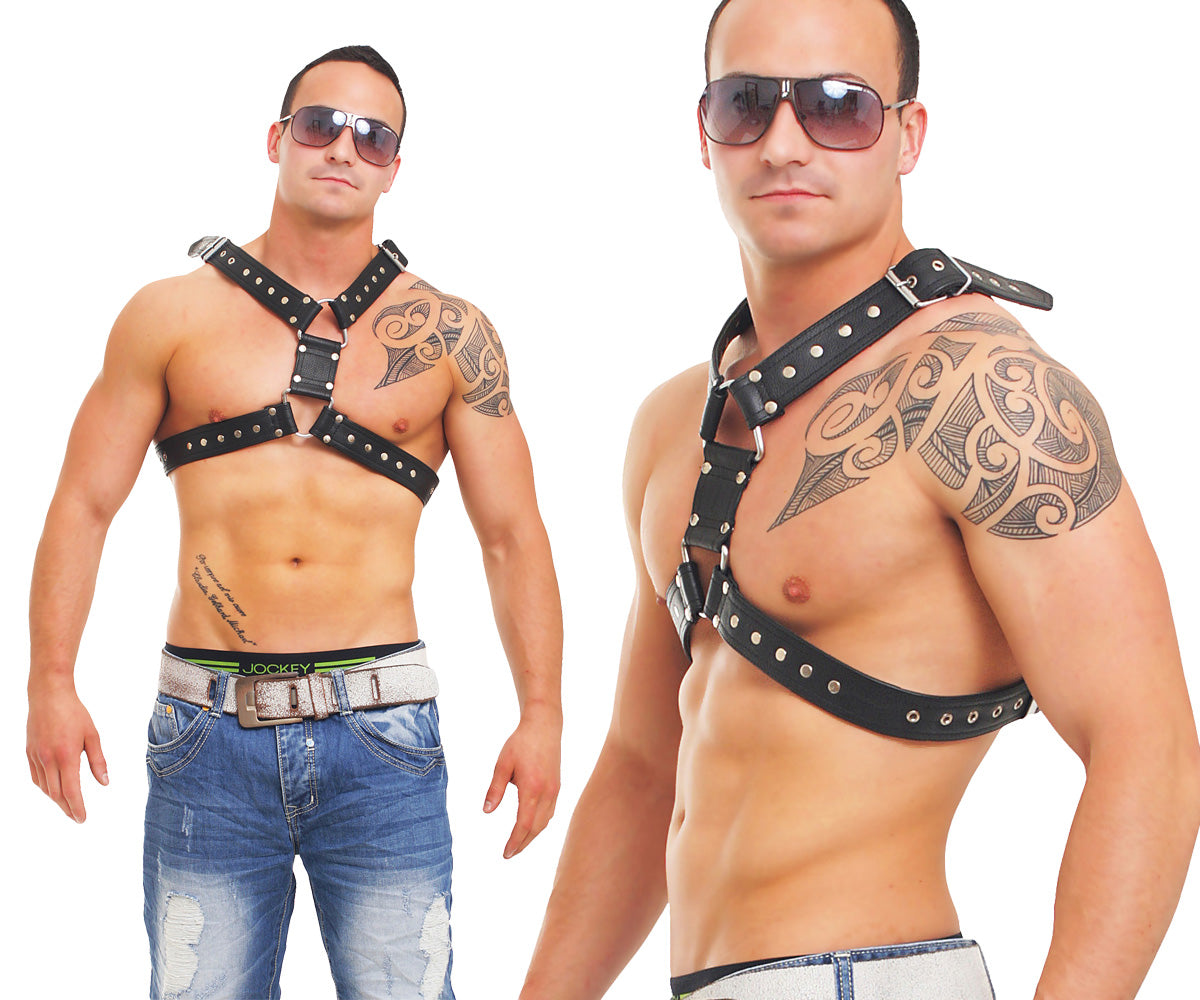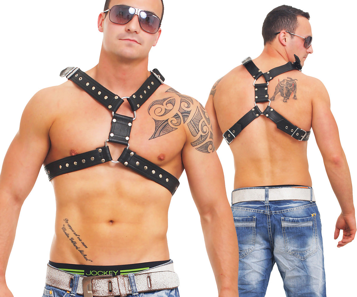 Echt Leder Brust Harness, aus Rindsleder, Nappaleder, doppellagig 4-fach vernäht, Stärke 4 mm, Breite 40 mm, Nieten verziert, Ösen verstärkt, Schnallen einstellbar, massive D-Ringe.