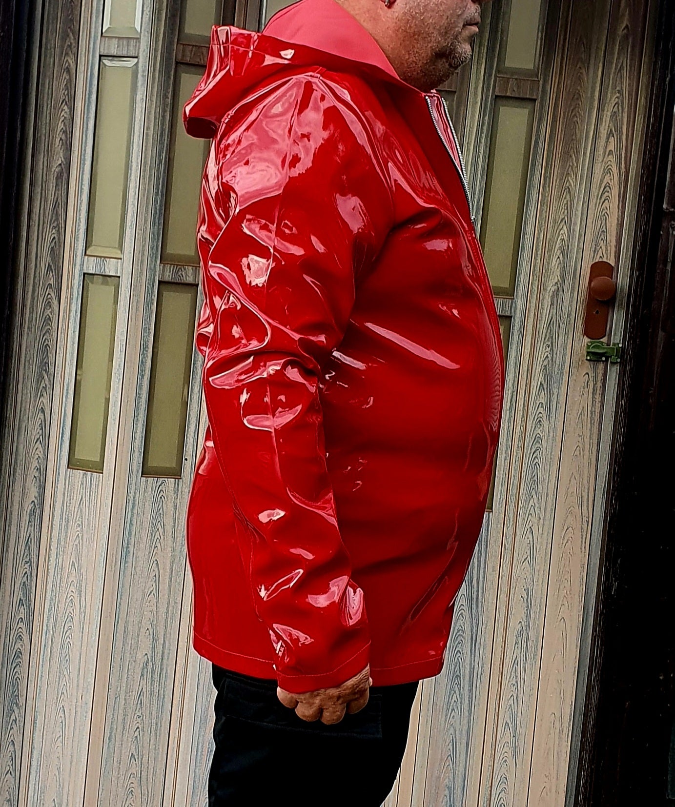 Lack Kapuzenjacke in Vinyl-Qualität, YKK Reißverschluss, Spreizkragen mit Kapuze. Angenehmes nicht klebendes Trägermaterial.