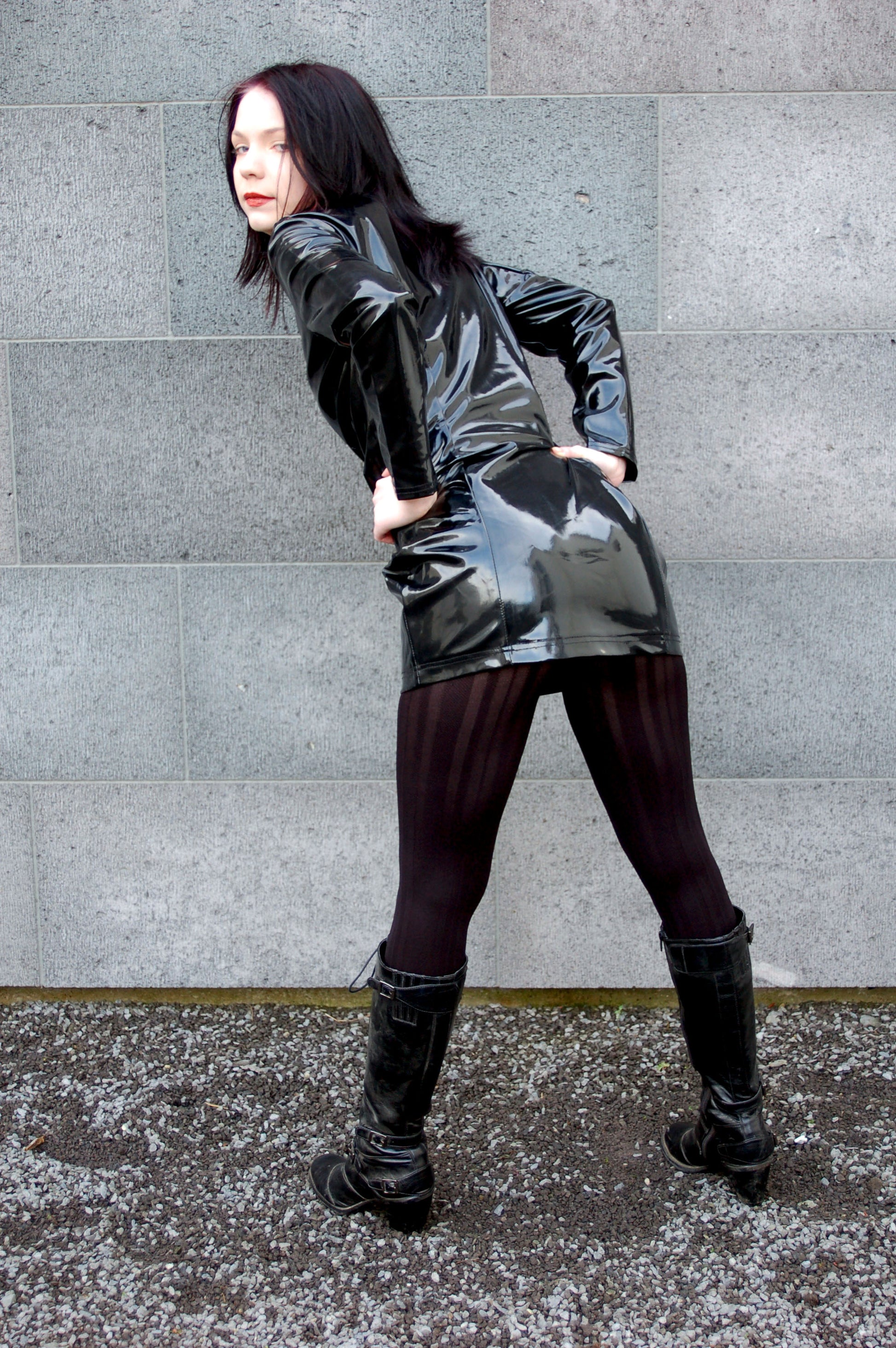 Lack Kleid in Vinyl Qualität mit langen Ärmeln, Frontseite mit Reißverschluss, rundem Halsausschnitt mit Stehkragen, angenehmes Innenmaterial. Hohe Materialstärke, nicht dehnbar, langlebig, nicht klebendes Trägermaterial.